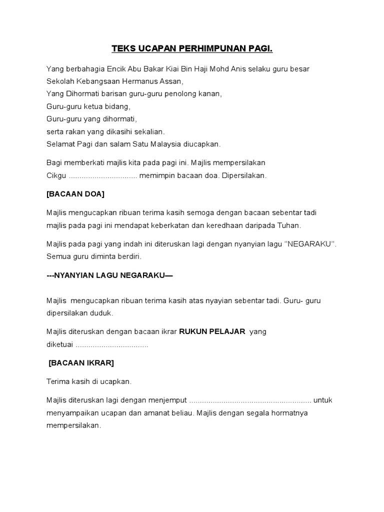 Teks Pengacara Majlis Perhimpunan Sekolah from imgv2-1-f.scribdassets.com السلام عليكم ورحمة الله وبركاته. Panduan teks pengerusi majlis perhimpunan pagi selasa ipg teks ucapan perasmian futsal 2011 these pictures of this page are about:teks ucapan pengerusi. Pengacara mengambil tempat pengacara majlis.2. Ucapan takziah, ucapan kematian, ucapan orang meninggal, ucapan org meninggal. Teks ucapan puan siti zawahir binti mohamed ketua pengarah jabatan bantuan guaman perhimpunan bulanan bheuu bil.3/2015. Ucapan yb dr maszlee bin malik. Idul fitri telah datang lagi di tahun ini. Bagi memberkati majlis perhimpunan di pagi yang mulia ini, majlis menjemput saudara _ untuk membacakan doa.