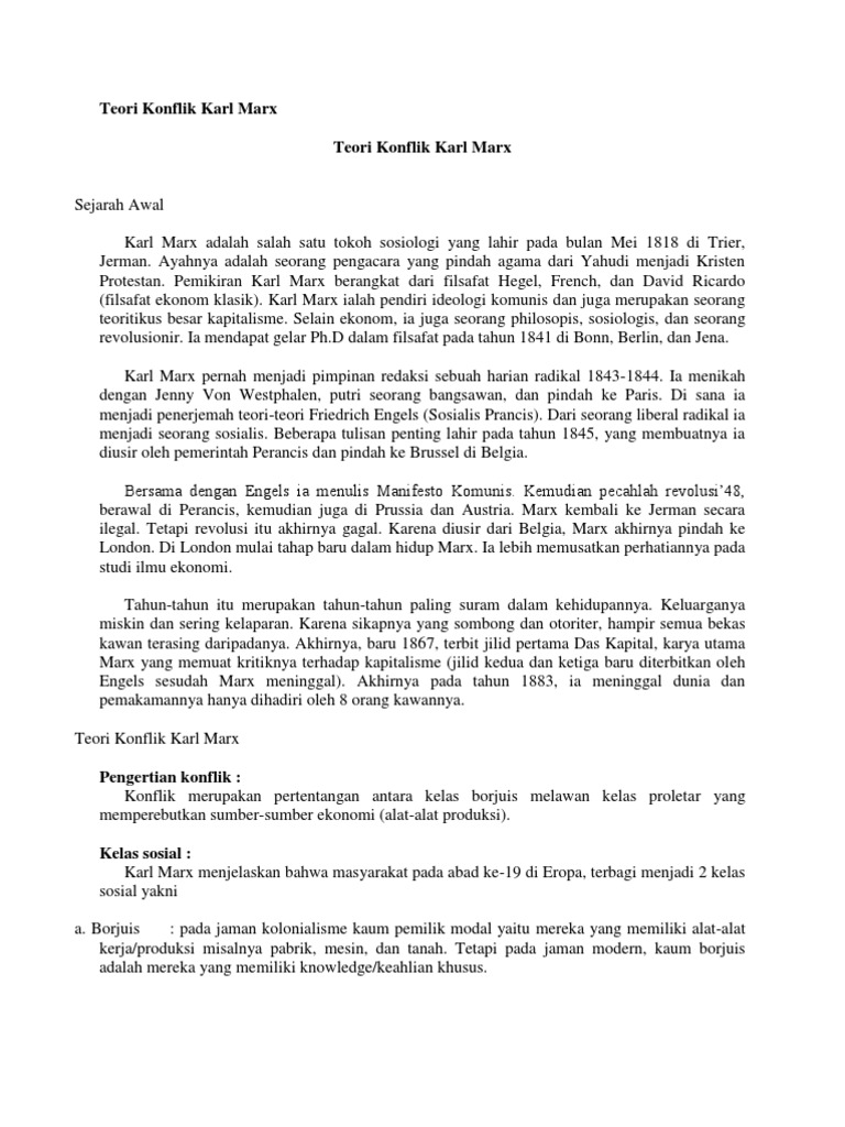 Tetapi jika agama dilarang, maka kita tidak akan mempunyai suatu pedoman untuk hidup didalam dunia ini. Communist manifesto study guide aplikasi di google play teori konflik. Presentasi teori konflik karl marx. Tugas kelompok teori sosiologi klasik karl marx kelompok 7 1. Marx karena ia menganalisis konflik tanpa. Karl marx meyakini bahwa inti dari kehidupan sosial adalah konflik. Teori sosiologi konflik adalah alternatif dari sebuah ketidakpuasan terhadap fungsionalisme struktural. Sumbangan karl marx terhadap teori pembangunan ekonomi dengan menitik beratkan masalah kapitalis yang menurut marx sendiri meramalkan bahwa kapitalis akan mengalami suatu keruntuhan dalam jangka panjang dan. Dalam perkembangan kajian teori sosial, kehadirannyamenjadi titik dasar dari proses kajian yang munculpada kerangka akademik studi sosiologi. Jadi, hubungan antar kelas adalah hubungan konflik. Teori ini sangat berbeda dari teori. Teori konflik menurut karl marx. Lahir di trier, prusia, pada tanggal 5 mei 1818.