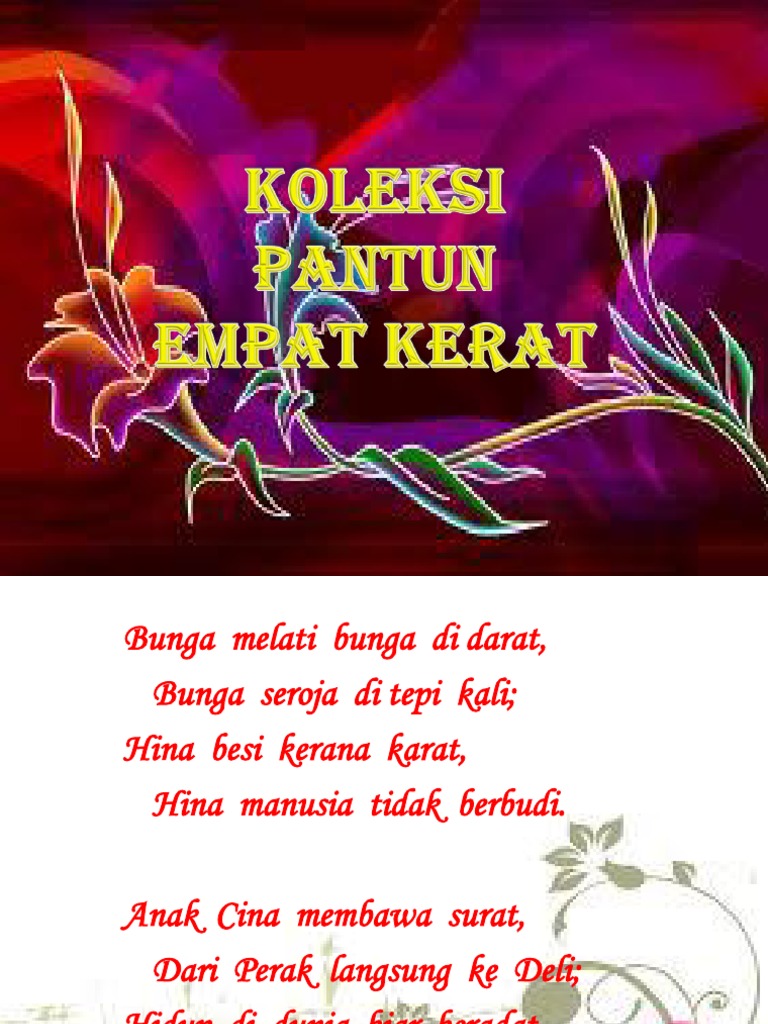 Pembelajaran kali ini berdasarkan aspek seni bahasa yang terdapat dalam bahasa melayu sekolah. Pendidikan juga efektif untuk menghadapi globalisasi. Pulau pandan jauh ke tengah rangkap 2. Selain itu, dengan pantun jenaka diharapkan bisa membuat suasana. Explore tweets about #pantun4kerat on twitter. Contoh pantun 4 kerat free download as word doc (.doc.docx), pdf file (.pdf), text file (.txt) or read online for free. Buah cempedak di luar pagar,ambil galah tolong jolok kan,saya budak baru belajar,kalau salah tolong tunjukkan. Kumpulan contoh pantun jenaka, pantun nasehat, teka teki, agama, pendidikan, cinta, romantis, persahabatan, perpisahan, ulang tahun, anak dll. I'm not being cheesy, just wanna say je t'aime #ciaciacia #pantun4kerat. Pantun yang dibenarkan hanyalah jenis pantun empat kerat, iaitu pantun empat baris yang mempunyai dua baris pembayang dan dua baris maksud. Pantun terdiri atas berbagai macam jenis jika didasarkan pada penyampaian isinya diantaranya ialah pantun jenaka, pantun nasehat dan lain sebagainya. Today is december, yesterday was november, we have gone through it together, and i promise i will remember. Gunung daik bercabang lapan, mana nak sama si gunung lima, adik datang sebab nak makan, kalau tak bagi adik bagi buku lima.